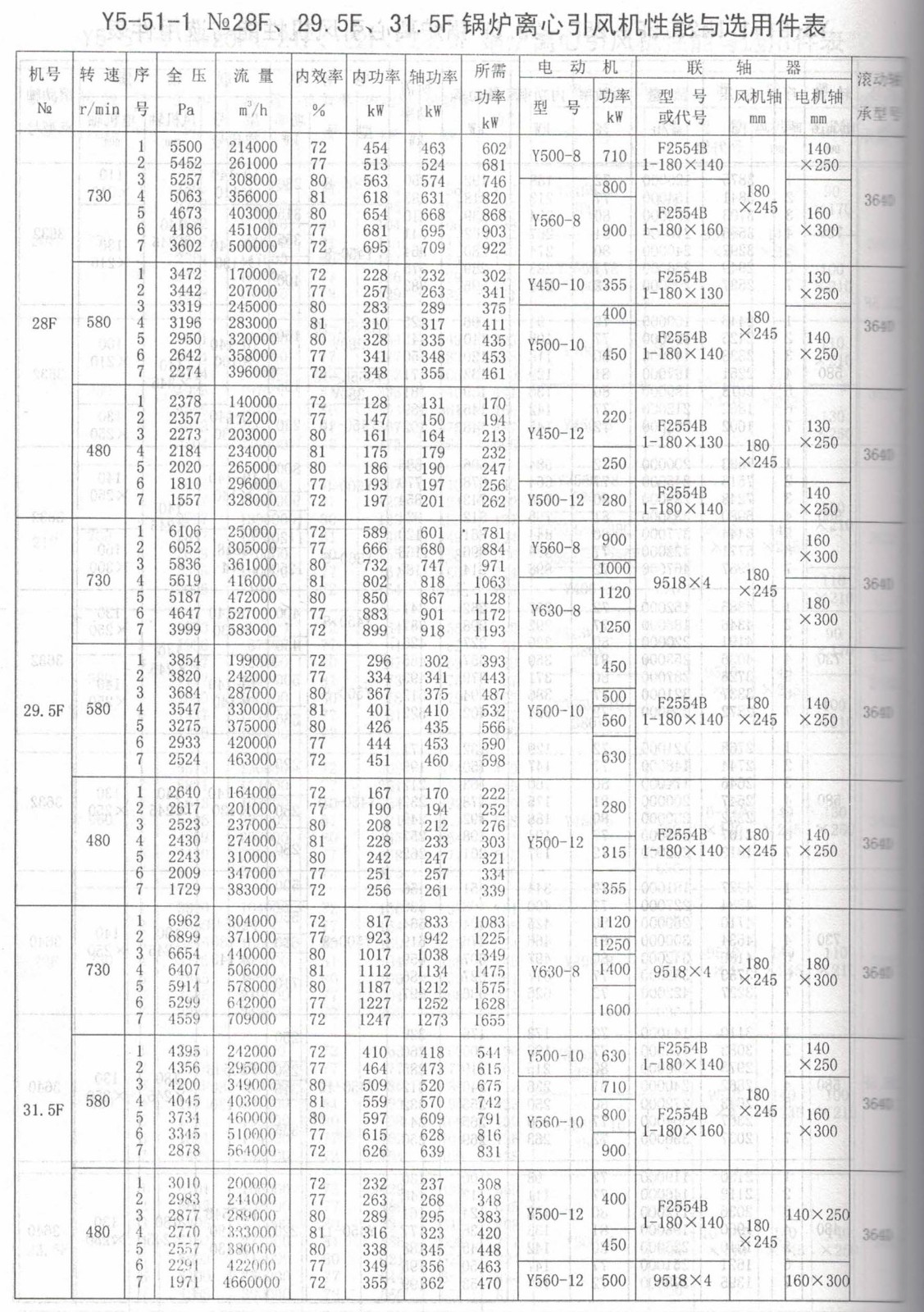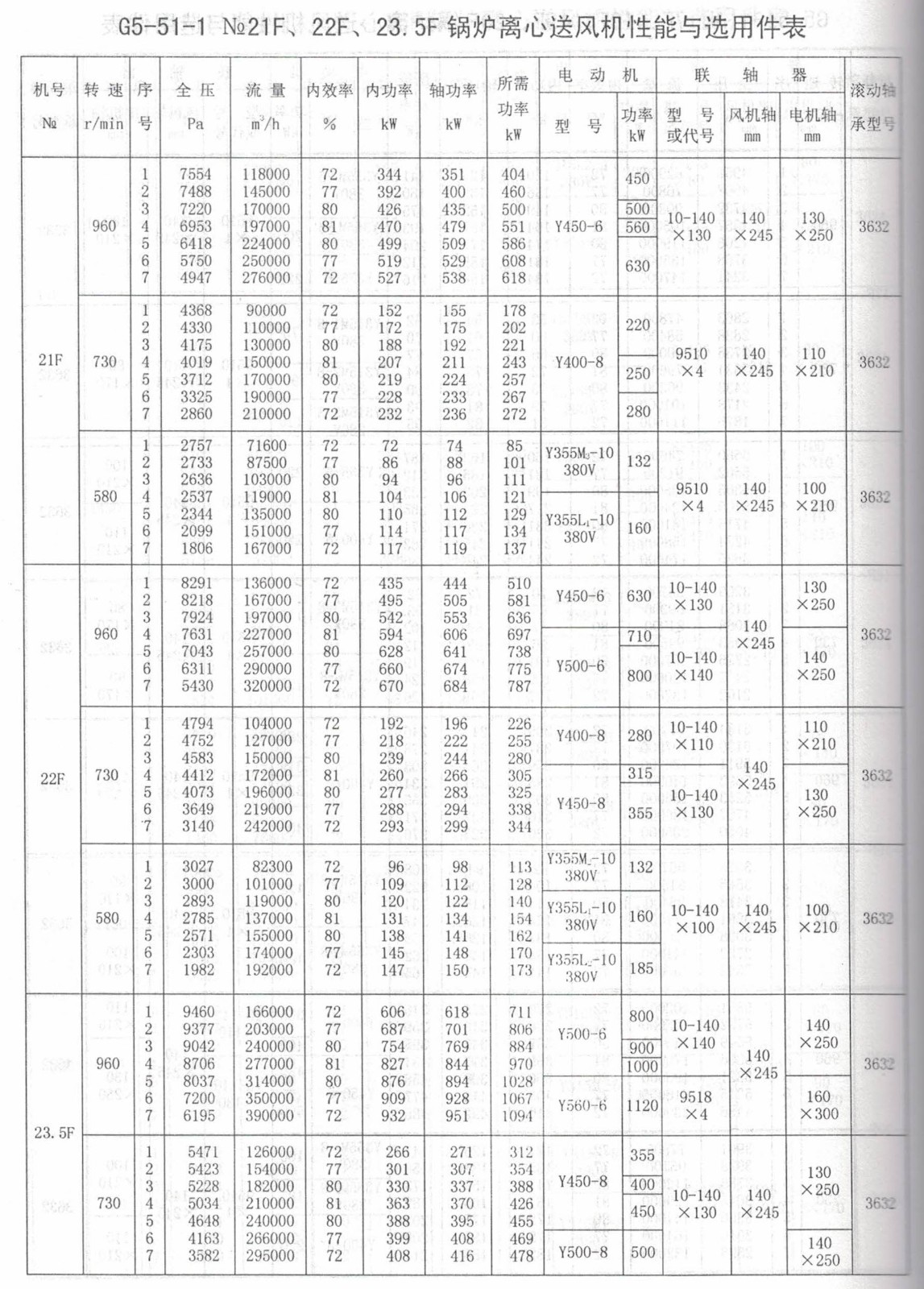G、Y5-51型鍋爐送引風(fēng)機(jī)主要是用于火力發(fā)電廠2t/h~670t/h蒸汽鍋爐的送引風(fēng)系統(tǒng),也滿足了流化床爐高壓頭性能參數(shù)之需求。該系列風(fēng)機(jī)也可用于除塵、礦井通風(fēng)及一般通風(fēng)系統(tǒng)。