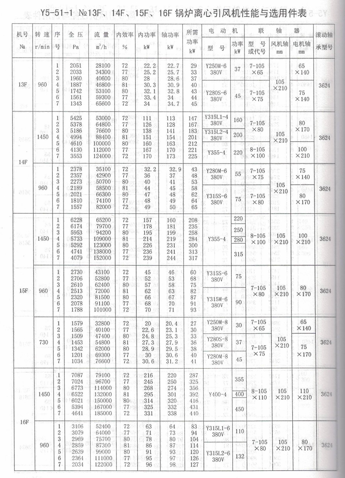 送風(fēng)機(jī)輸送的介質(zhì)為空氣,引風(fēng)機(jī)輸送的介質(zhì)為煙氣或含雜質(zhì)顆粒之氣體。含雜質(zhì)濃度小于200mg/m3時(shí)葉輪可用五年以上。如含雜質(zhì)大也可使用,但使用壽命相對縮短。送引風(fēng)機(jī)最高使用溫度不得超過250℃。性能參數(shù)條件:通風(fēng)機(jī)進(jìn)口壓力P=101325Pa,進(jìn)口溫度t=20℃,介質(zhì)密度ρ=1.2kg/m3;引風(fēng)機(jī)進(jìn)口壓力P=101325Pa,進(jìn)口溫度t=140℃,介質(zhì)密度ρ=0.85kg/m3.未注聯(lián)軸器型號均為F2508A。