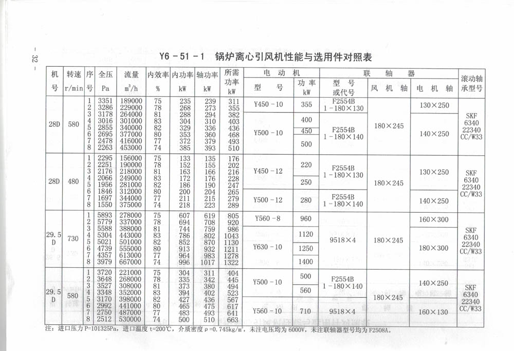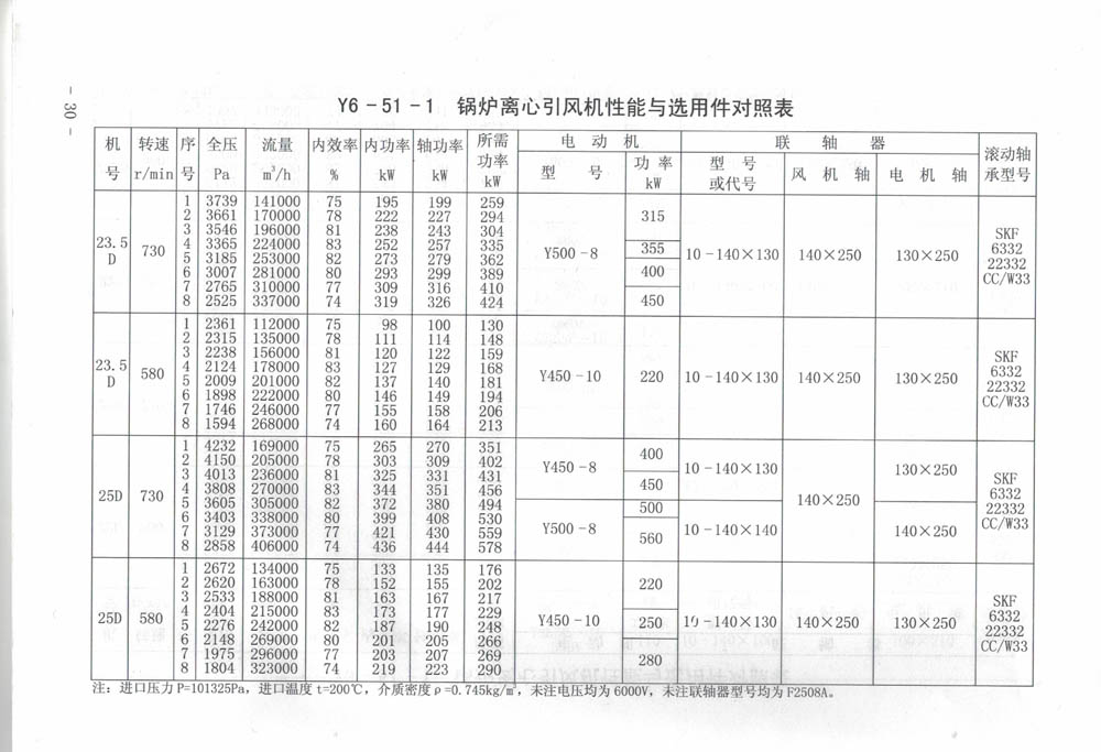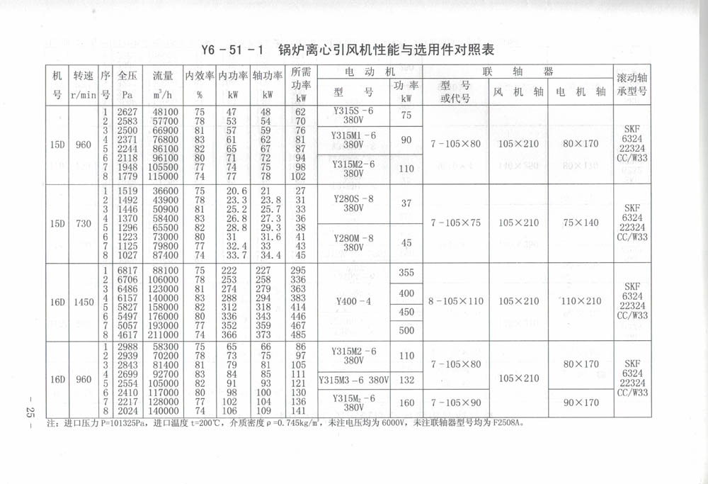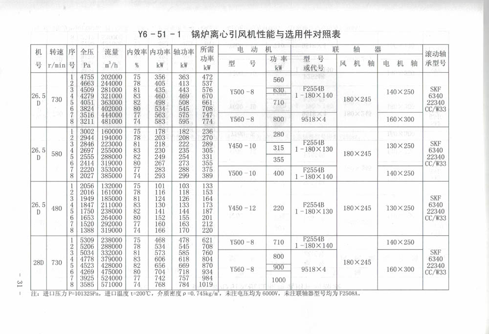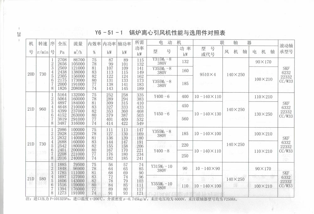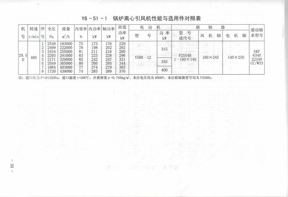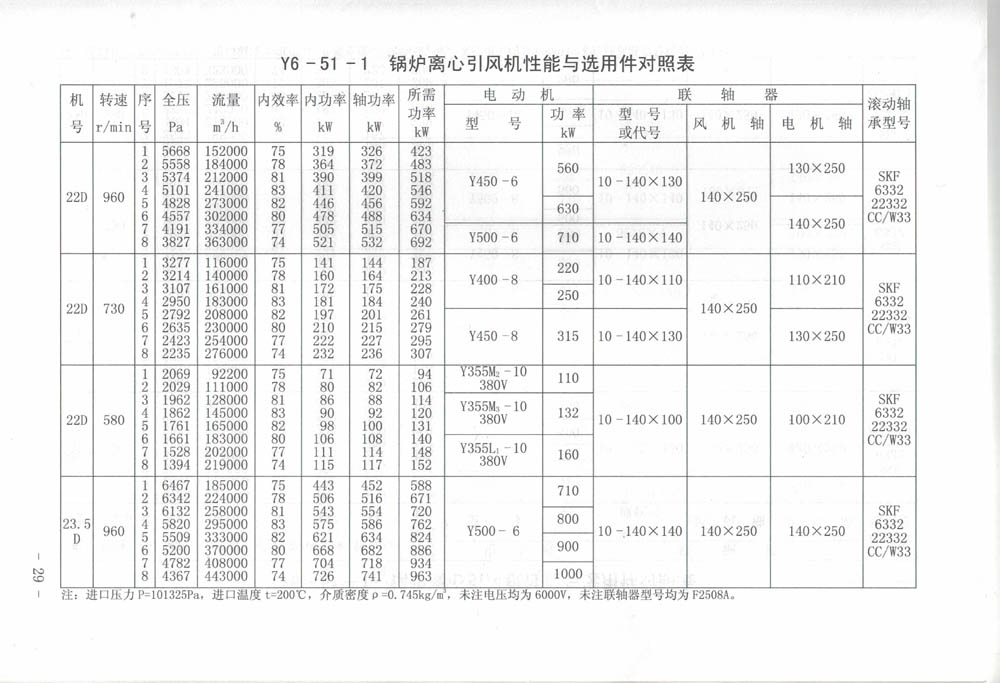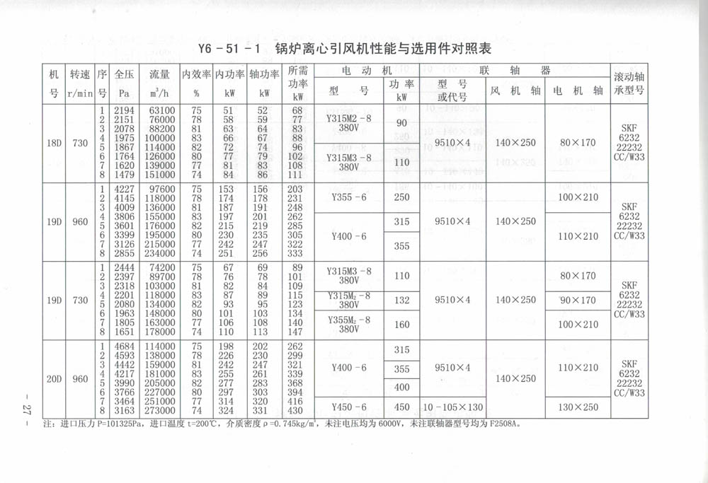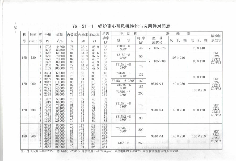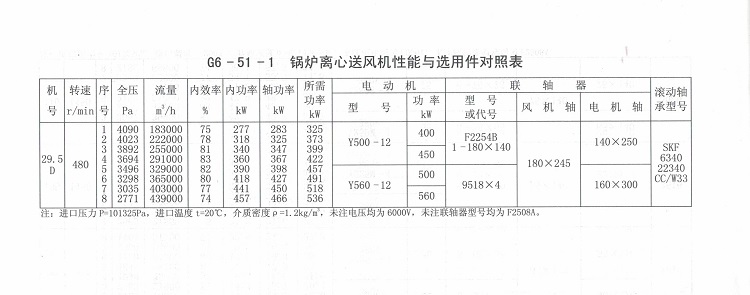 送風(fēng)機輸送的介質(zhì)為空氣,引風(fēng)機輸送的介質(zhì)為煙氣或含雜質(zhì)顆粒之氣體。含雜質(zhì)濃度小于200mg/m3時可用四年以上。如含雜質(zhì)大也可使用,但使用壽命相對縮短。送引風(fēng)機最高使用溫度不得超過250℃。性能參數(shù)條件:通風(fēng)機進口壓力P=101325Pa,進口溫度t=20℃,介質(zhì)密度ρ=1.2kg/m3;引風(fēng)機進口壓力P=101325Pa,進口溫度t=200℃,介質(zhì)密度ρ=0.745kg/m3。未注聯(lián)軸器型號均為F2508A。