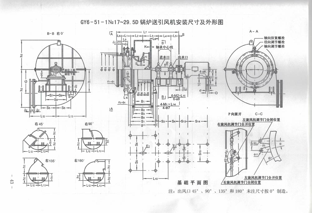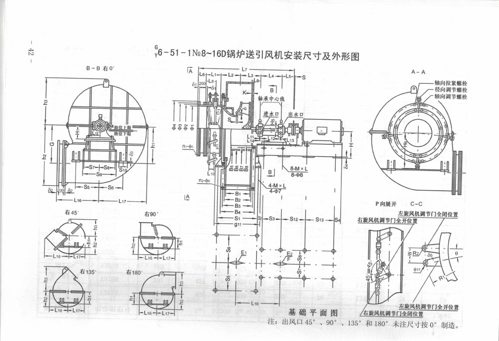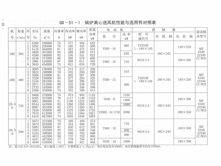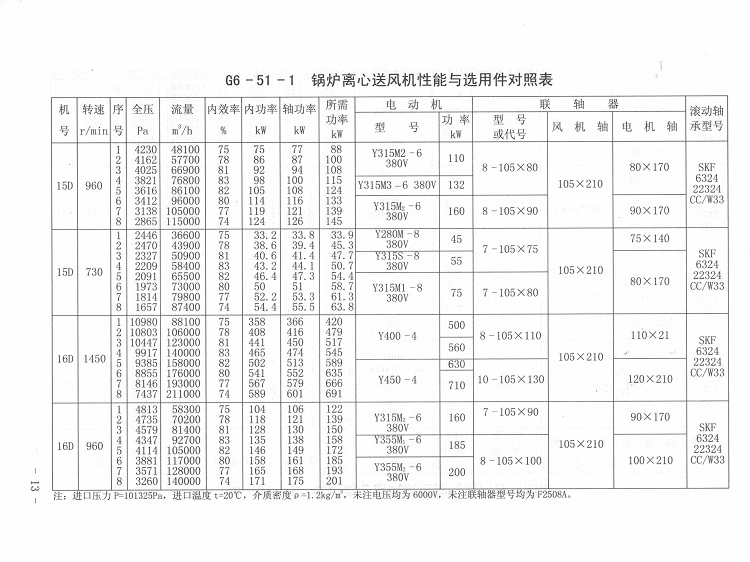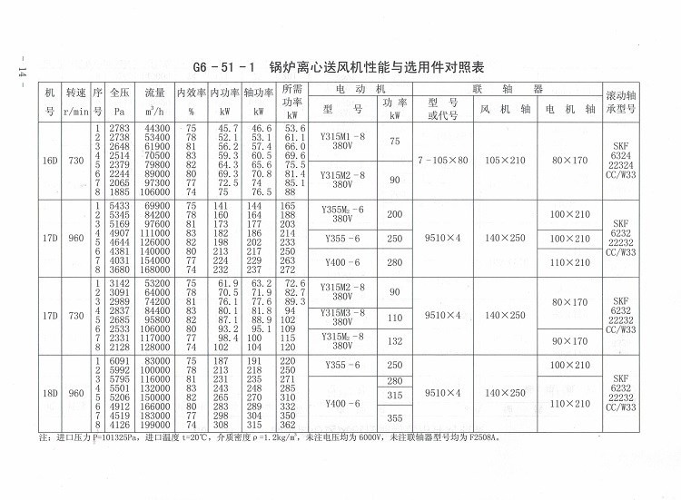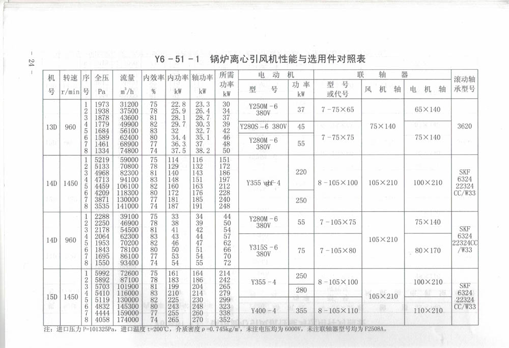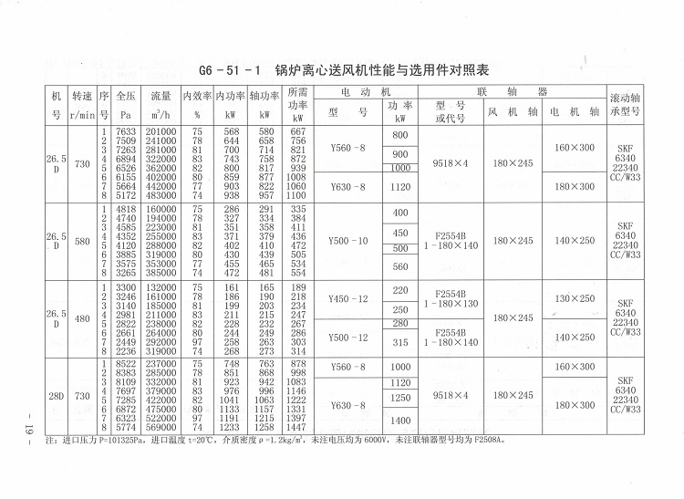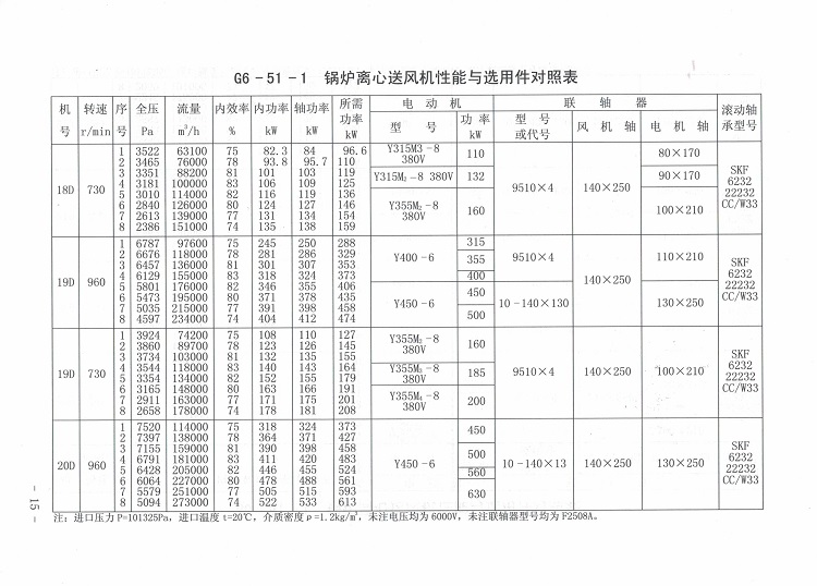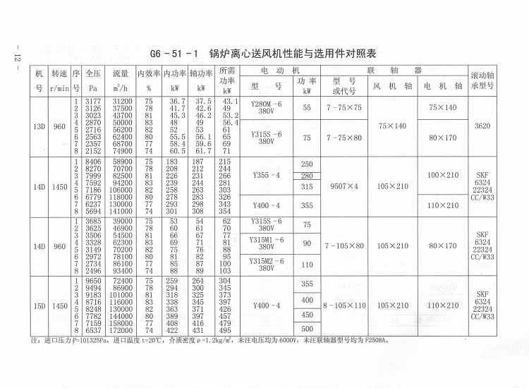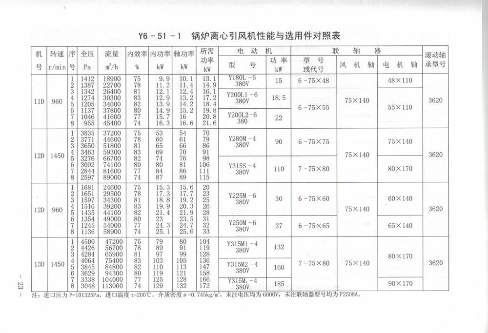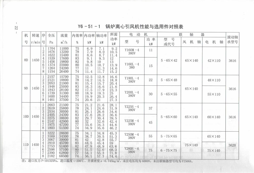 送風(fēng)機輸送的介質(zhì)為空氣,引風(fēng)機輸送的介質(zhì)為煙氣或含雜質(zhì)顆粒之氣體。含雜質(zhì)濃度小于200mg/m3時可用四年以上。如含雜質(zhì)大也可使用,但使用壽命相對縮短。送引風(fēng)機最高使用溫度不得超過250℃。性能參數(shù)條件:通風(fēng)機進口壓力P=101325Pa,進口溫度t=20℃,介質(zhì)密度ρ=1.2kg/m3;引風(fēng)機進口壓力P=101325Pa,進口溫度t=200℃,介質(zhì)密度ρ=0.745kg/m3。未注聯(lián)軸器型號均為F2508A。