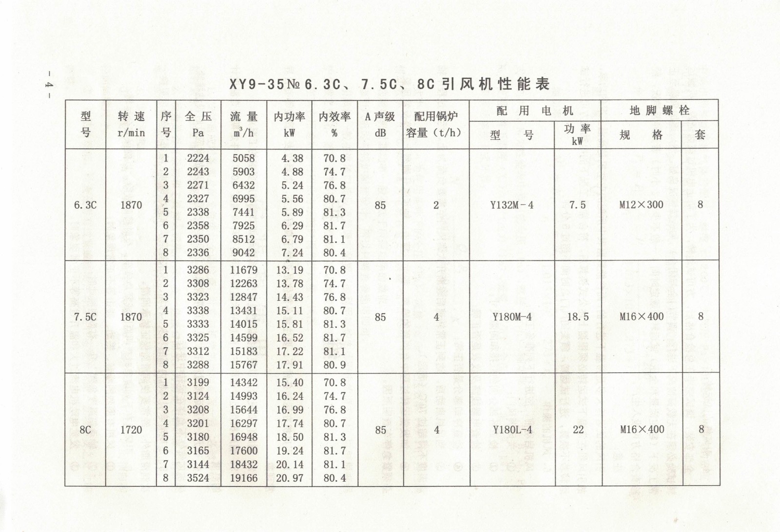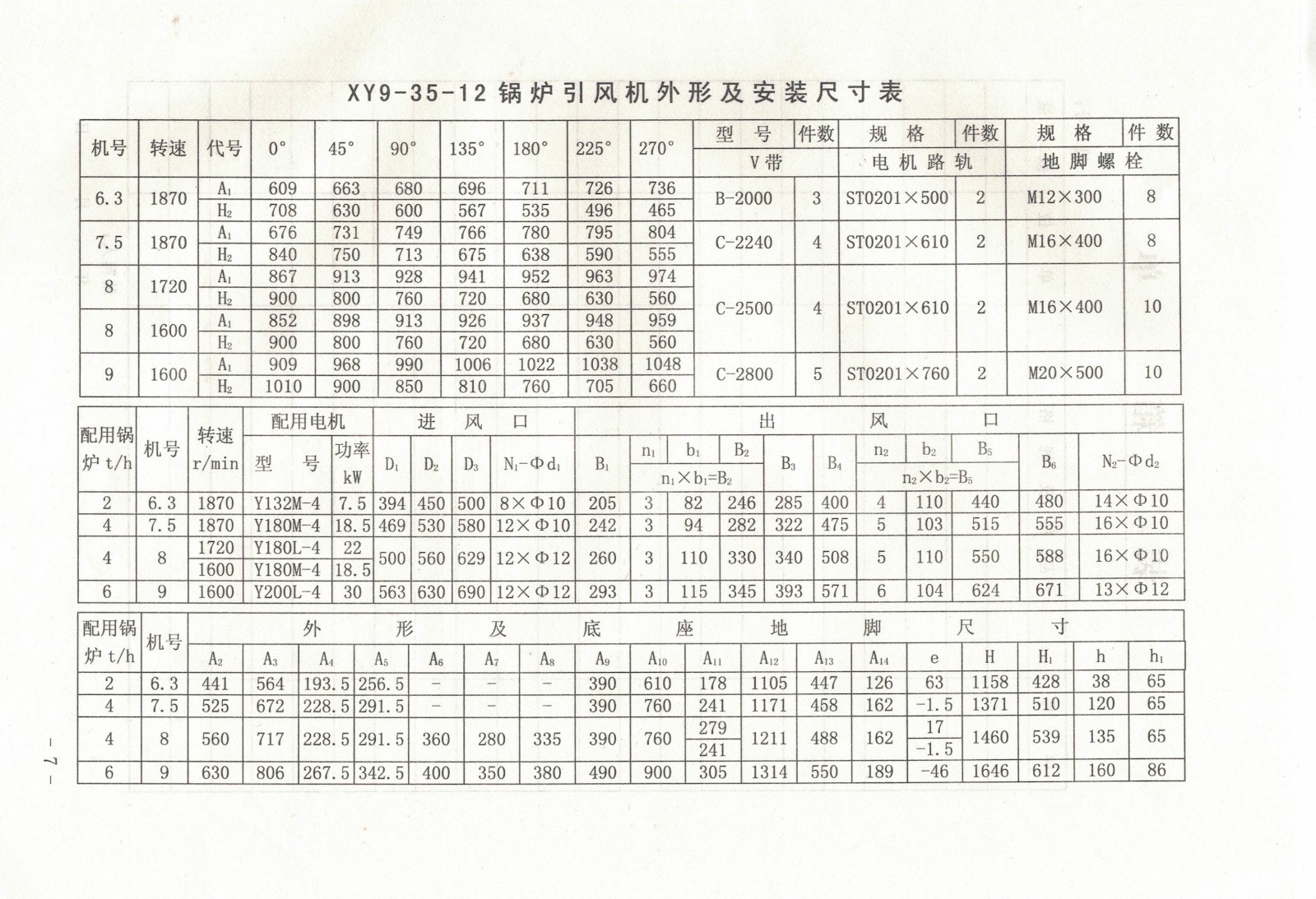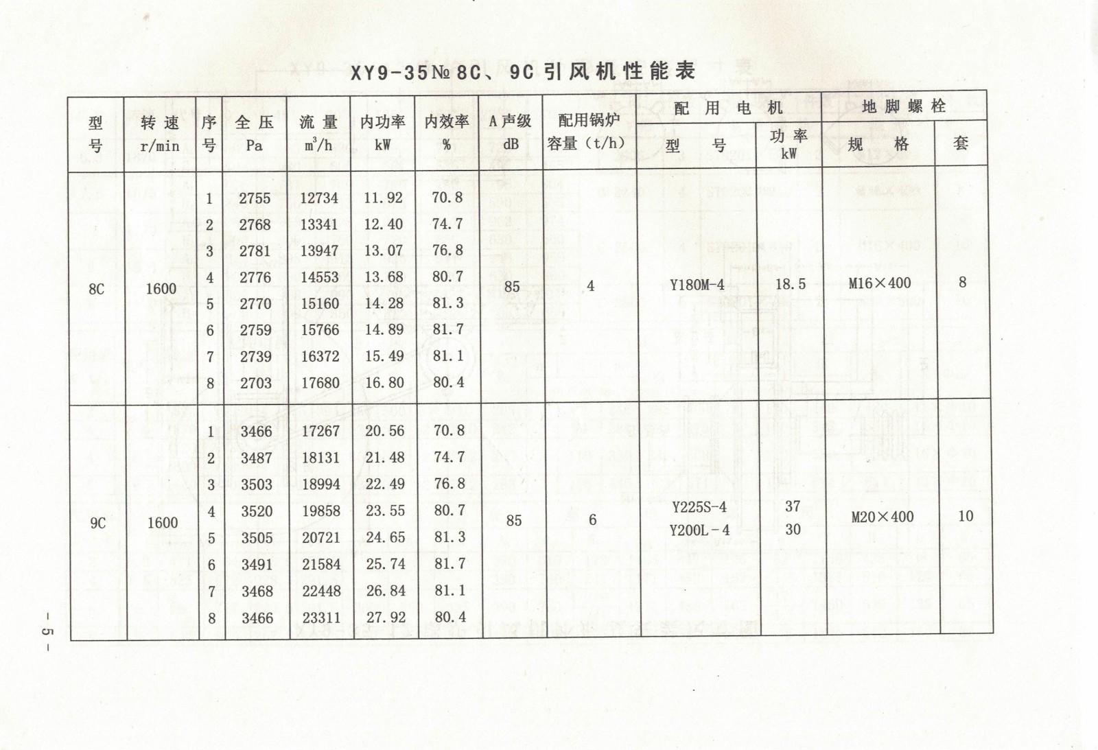 目前鍋爐系列較多,燃用煤質(zhì)差別較大,加裝除塵設(shè)備和余熱利用設(shè)備之后,產(chǎn)生抽力不足從而影響正常運(yùn)行,為了克服由上述原因所致抽力不足或爐膛出現(xiàn)正壓等影響鍋爐燃燒和正常運(yùn)行的現(xiàn)象,故設(shè)計(jì)制造了其風(fēng)量、風(fēng)壓與鍋爐相匹配的XY9-35鍋爐離心引風(fēng)機(jī)供用戶選用。其它性能相近者亦可選用。