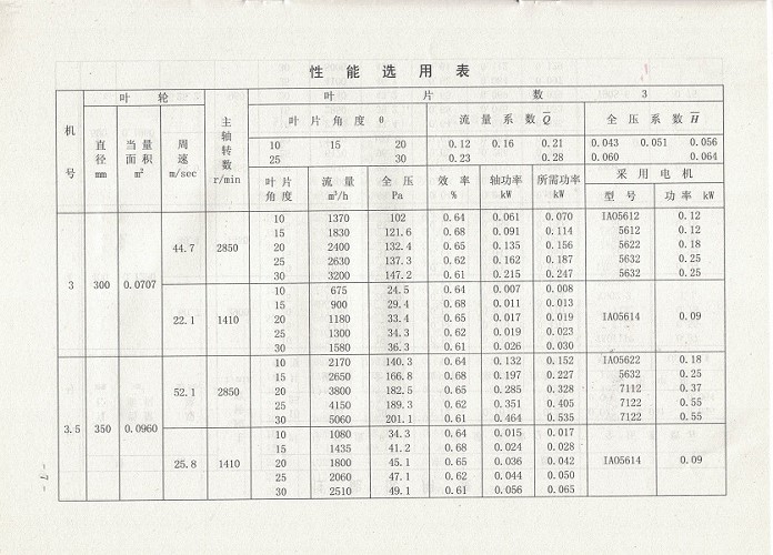 本風機共有46個品種,其中3葉片、6葉片、8葉片和9葉片的有九個機號,按葉輪直徑大小,由小到大的次序依次排列為: Na3、 3.5、 4、5、6、7、8、9、10;其中4葉片的共有十個機號,按葉輪直徑的大小,由小到大的次序排列依次為: N2.5、3、3.5、4、5、6、7、8、9、10。